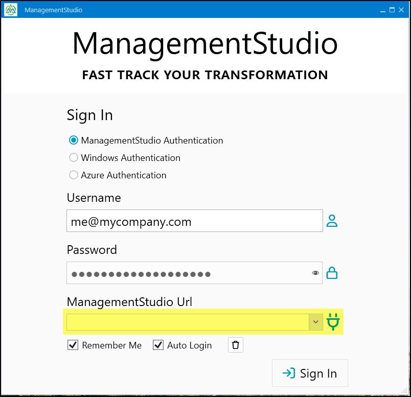 Note: The first time you log into ManagementStudio you'll need to provide the 'ManagementStudio Url':